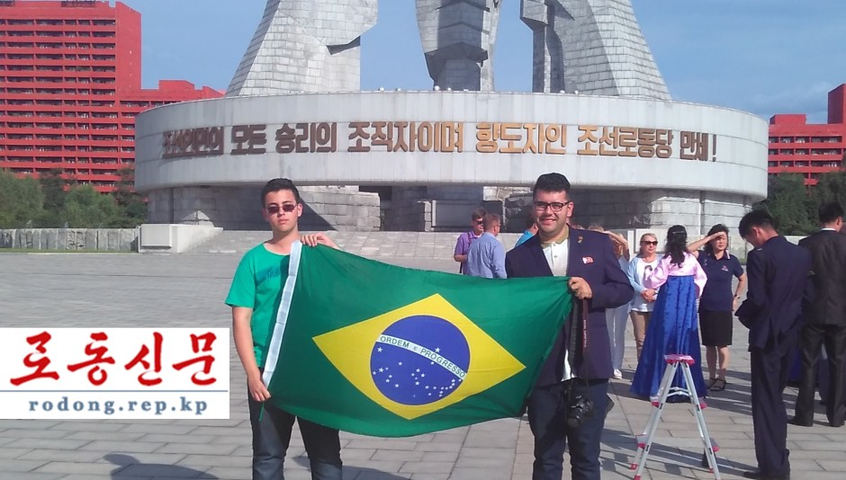 Os dois jovens disseram que o ato de segurarem a bandeira nacional de seu país e tirar fotos em frente ao Monumento à Fundação do Partido significa que o povo brasileiro se solidariza e apoia a República Popular Democrática da Coreia.