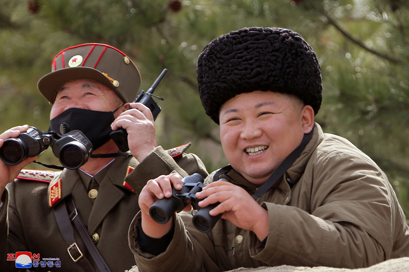 Kim Jong Un, Presidente do Partido do Trabalho da Coreia e da Comissão de Assuntos Estatais da República Popular Democrática da Coreia e Comandante Supremo das Forças Armadas da RPDC, voltou a dirigir um treinamento de ataque de fogo das subunidades de artilharia de longo alcance da frente do Exército Popular da Coreia em 9 de março de 2020.