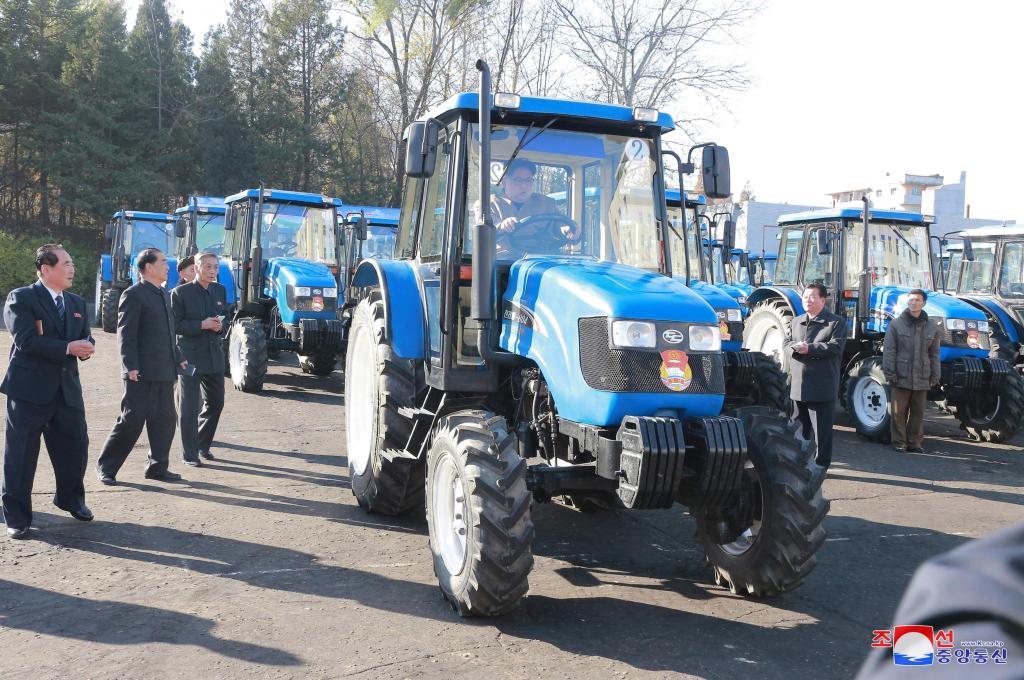 A produção de novos tipos de tratores e máquinas agrícolas pela própria indústria nacional da RPDC também tem sido uma tarefa perseguida pelo Estado. Na imagem, Kim Jong Un dirige um trator recém-fabricado. (Foto: KCNA)