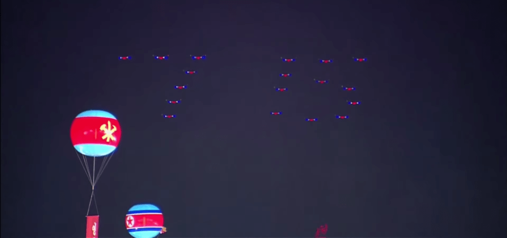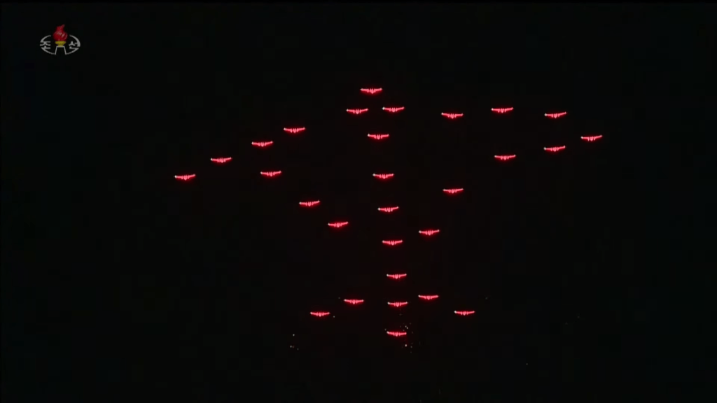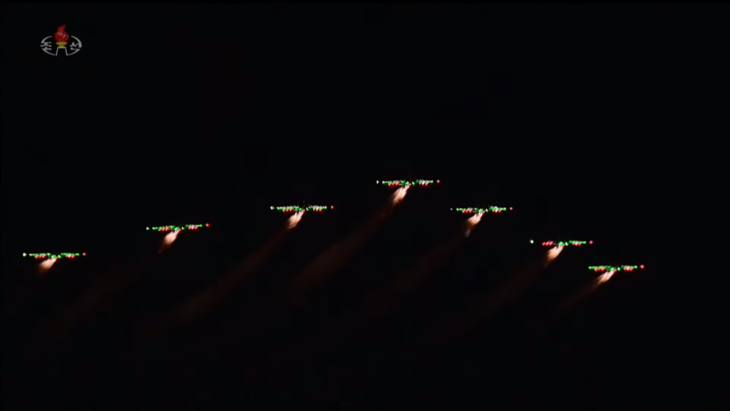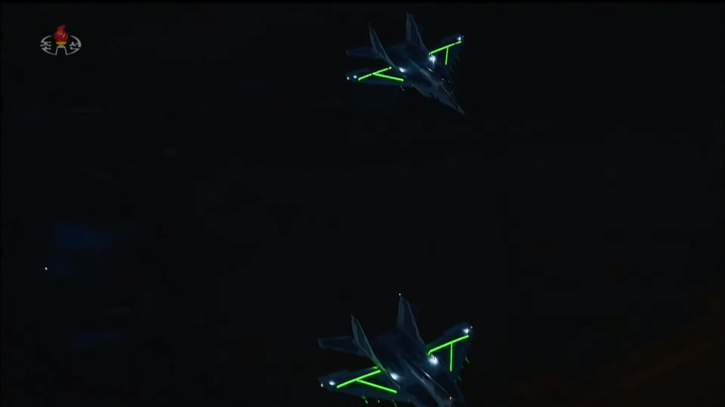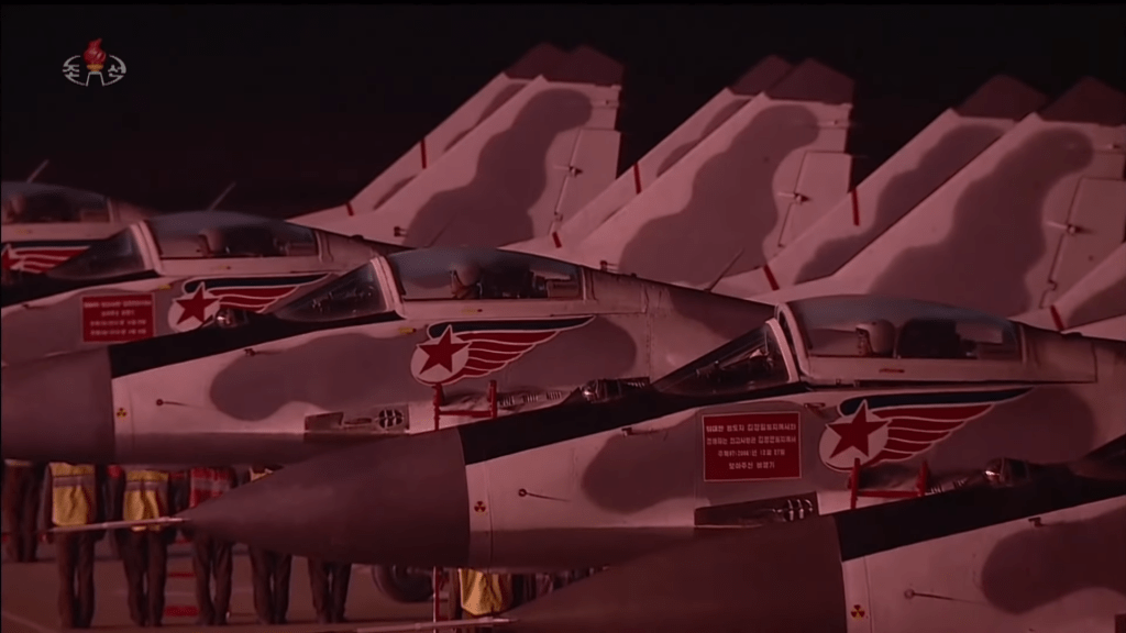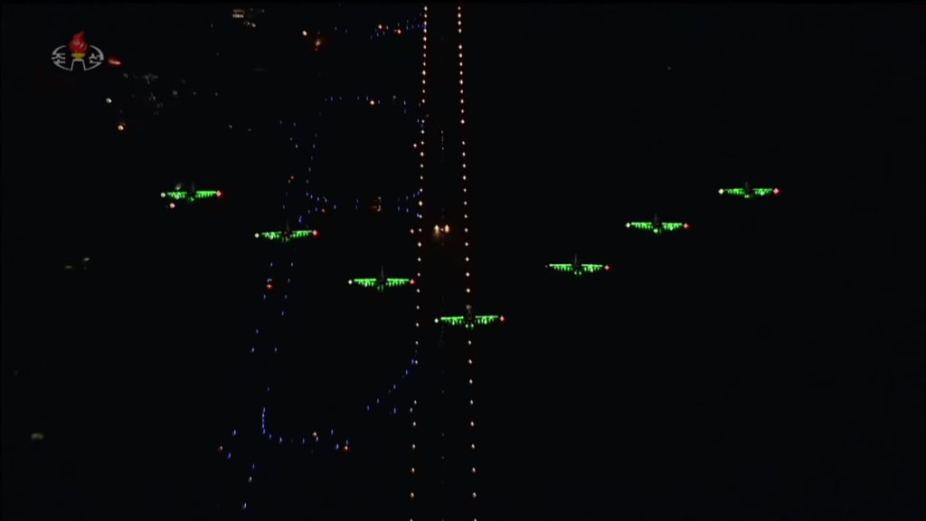 Na transição entre o desfile das unidades de soldados e as colunas motorizadas, foi exibido um incrível show aéreo com aviões MiG-29 e Su-25. Dotados de luzes led, as aeronaves coloriram o céu noturno de Pyongyang com shows coreografados, formando o símbolo do Partido (a foice, martelo e pincel) e o número 75. As acrobacias arrancaram salvas do público presente.