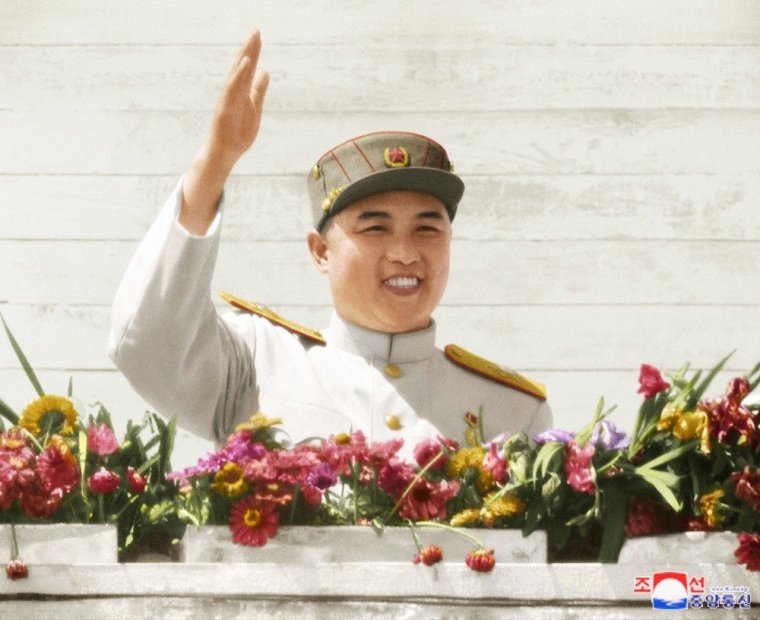 Kim Il Sung em desfile festivo em razão da vitória sobre os EUA na Guerra de Libertação da Pátria (1950-1953)